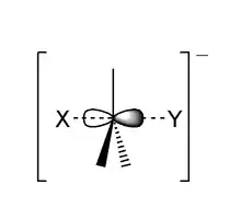 The reaction most often occurs at an aliphatic sp3 carbon center with an electronegative, stable leaving group attached to it (often denoted X), which is frequently a halide atom. The breaking of the C–X bond and the formation of the new bond (often denoted C–Y or C–Nu) occur simultaneously through a transition state in which a carbon under nucleophilic attack is pentacoordinate, and approximately sp2 hybridised. The nucleophile attacks the carbon at 180° to the leaving group, since this provides the best overlap between the nucleophile's lone pair and the C–X σ* antibonding orbital. The leaving group is then pushed off the opposite side and the product is formed with inversion of the tetrahedral geometry at the central atom.