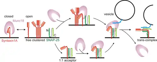 The first step in synaptic vesicle fusion is tethering, where the vesicles are translocated from the reserve pool into physical contact with the membrane. At the membrane, Munc-18 is initially bound to syntaxin 1A in a closed structure. It is postulated that the dissociation of Munc-18 from the complex frees syntaxin 1A to bind with the v-SNARE proteins.[45] The next step in release is the docking of vesicles, where the v- and t-SNARE proteins transiently associate in a calcium-independent manner. The vesicles are then primed, wherein the SNARE motifs form a stable interaction between the vesicle and membrane. Complexins stabilize the primed SNARE-complex rendering the vesicles ready for rapid exocytosis.