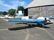 The Rallye was fitted with a bulbous cockpit, which was capable of accommodating two/three people in the basic lower-powered variants and up to four personnel within the more powerful models of the aircraft, some of which were designed to function as glider tugs and banner bearers.[24] The canopy slides rearwards to provide access to and from the cockpit, aided by a step located just underneath the wing's trailing edge; on the ground. On the ground, the canopy should remain slightly open when occupied to allow for adequate airflow; in flight, the canopy can be left open at speed up to a maximum of 94 knots.[21][22]