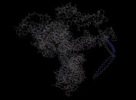 ![]() SOGA2's 3d structure predicted by Phyre2.[24] Structure is based on the crystal structure of tropomyosin at 7 angstrom resolution, with 12% identity. 283 residues match, in the CCDC containing N-terminal region. |