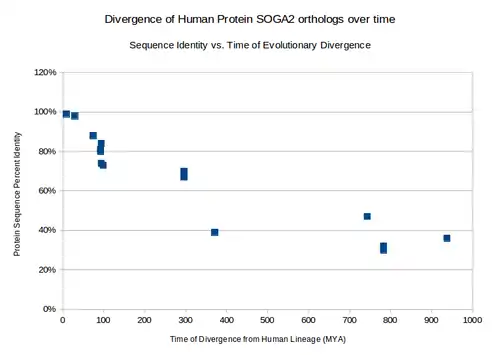 There are two main paralogs to SOGA2: human protein SOGA1 and human protein SOGA3.[9] SOGA1 has been shown to be involved in suppression of glucose by autophagy.[12] The rate at which orthologs diverge from SOGA2 human(measured by % identity) places the approximate duplication event of SOGA1 from SOGA2 at ~254.1 MYA and the duplication event of SOGA3 from SOGA2 ~329.1 MYA.