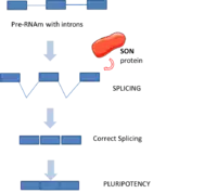 Human embryonic stem cells are able to undergo the process of differentiation into specific and relevant cells. To maintain the pluripotency of the embryonic stem cells, transcription factors and epigenetic modifiers play an important role despite the fact that little is known about the regulation of pluripotency throughout the process of splicing. The factor SON is identified as essential for the maintenance of this pluripotency. It is confirmed that SON regulates the splicing process of transcripts (RNAm) that will encode the gens that are going to regulate the pluripotency of the embryonic human cells.[14]