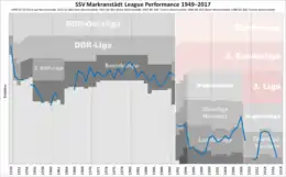 Following German reunification in 1990 Turbine adopted its current identity as Spiel- und Sportverein Markranstädt. The merger of the football competitions of the two Germanys saw SSV placed in the Landesliga Sachsen (V) where they would stay until relegated in 1993. The team re-bounded to return to fifth-tier play in 1995, but was again immediately sent down and did not return to the Landesliga until 1999. Following their 2007 divisional championship, Markranstädt was promoted to the NOFV-Oberliga Süd (IV), where they earned mid-table results in the next two seasons.