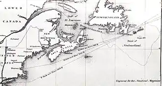 Arctic passed Cape Clear, at the southernmost point of Ireland, early on the morning of September 21, and entered the open Atlantic approaching her maximum speed of 13 knots (15 mph). In settled weather she progressed uneventfully, and early on September 27 had reached the Grand Banks, off the coast of Newfoundland.[25] This area is formed by a series of relatively shallow submarine plateaus forming part of the Canadian continental shelf.[26] Here, the sub-Arctic waters of the Labrador Current meet the warm northbound waters of the Gulf Stream, to create weather systems typified by intermittent mists and fog.[27][28] It was the practice for steamers to maintain maximum speeds in these conditions, although before electronic aids to navigation the risk of collision was considerable. Keeping schedules was considered paramount, particularly in the Collins Line where, Alexander Brown states in his 1962 account, "there was no room for overcautious shipmasters".[29] On the morning of September 27, Luce observed typical Grand Banks conditions: "at intervals of a few minutes a very dense fog, followed by being sufficiently clear to see one or two miles."[30]