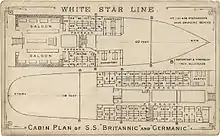 The ship had three decks enclosed within the hull, the upper two of which were above the waterline. Britannic and Germanic's saloon accommodations, consisting of a number of two- and four-berth cabins were located in the centre of the upper of these decks. The steerage accommodations were located on the lower two decks and consisted of large open berth dormitory type cabins arranged around the edge of the deck, with an open space for the passengers to congregate in the centre. The steerage accommodation was of higher quality than was typical for ships of the period, being well lighted, ventilated and heated. An innovative feature of Britannic and Germanic was a ventilation system driven by a large steam powered fan, which could propel hot or cold air to every portion of the ship.[4][1]