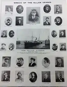 A disaster fund was established for those who were dependants of the deceased, the Steam Packet contributed £1,000 to this fund. It was set up by The Daily Telegraph at writer Hall Caine's instigation. Caine headed the list of contributors and wrote a poem The Loss of the Ellan Vannin.[11] The crew of 21 included one woman, a Mrs. Collister, of Crosby, Isle of Man, who left one child. The 20 men were survived by 18 widows and 70 children. All but two of the crew lived on the Isle of Man. Five of the passengers came from off Island, the rest from the north of the Island. The last beneficiary of the fund was a Miss Benson of Ramsey, the daughter of one of the crew. She was 20 at the time of the disaster and was in very poor health. She was the last beneficiary of the fund, dying in 1974 at the age of 85.