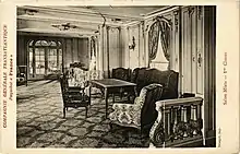 Her first class accommodations were graced with various portraits of Louis XIV as well as his relations. France was also credited for bringing the grand staircase to the ocean liner, a fashion which prevails in modern cruise ships. Her First Class entrance hall and dining room demonstrated this.[5] The staircase in the dining room was in fact copied from the Parisian Hôtel de Toulouse.[3] Further unique points included her Cafe Terrasse and the Salon Mauresque, the latter a reference to the French colonial empire in Africa. The ship also had a gymnasium, an elevator, and a hair salon, all great novelties at the time.[4] Style Louis seize (Louis XVI) was also used within the private apartments of the grand luxe suites on board. According to a 1912 booklet publicising the liner, her second class accommodation was credited as "match[ing] the richness and comfort of first class on the old liners."[4] Passengers in this class could also utilise a hair dressing salon.[4] Third and steerage classes were also praised as being well-appointed.
