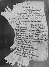 In 1875, a detailed list of all passengers and crew was published by J.H. Lewis, Printer & Publisher, albeit with several errors and spelling mistakes.[26] That document was used as the main source of the following survivors' table.