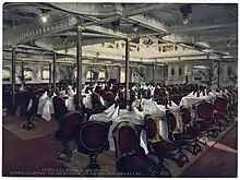 The interiors were graced with statues, mirrors, tapestries, gilding, and various portraits of the Imperial family. The interiors of her sister ships were also placed in the hands of Poppe. The first class salon was noted for its tapestries and its blue seating.[30] The smoking room, a traditionally male preserve, was made to look like a typical German inn.[31] The dining room, capable of holding all passengers in one sitting, rose several decks and was crowned with a dome. The room also had columns and had its chairs fixed to the deck, a typical feature of ocean liners of the era.[32]