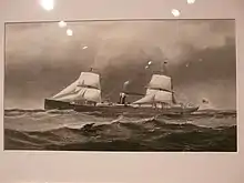 Pennsylvania departed Philadelphia on her maiden voyage on May 22, 1873, commanded by Captain George Sumner and with a complement of 56 first-class passengers, including Major Thomas T. Firth, a leading executive of the Pennsylvania Railroad Company, and his wife. The voyage proved not without incident as the ship shed propeller blades during the transatlantic crossing, and she arrived at Liverpool under sail, after which she spent some time in drydock undergoing repairs.[11] By June 23 she was ready to make the return voyage, with a full complement of passengers and a substantial cargo.[12] Pennsylvania thereafter would continue to make regular crossings between Philadelphia and Liverpool for the next thirteen years.[13]