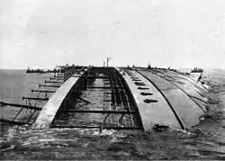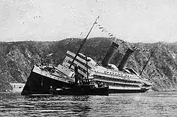 At 12:25 pm on 22 September 1907 the nearly completed Principessa Jolanda was launched before a large audience of onlookers, government officials and foreign journalists. After travelling down the slipway, the ship immediately became unstable and heeled sharply to port. Efforts by tugboats and shipyard workers to rescue the situation, including lowering the anchors to starboard to counteract the movement, were unsuccessful. After 20 minutes the vessel's list was such that it began taking on water through openings in the upper decks. She soon capsized with her funnels a few metres above and parallel to the water. Within an hour she finally slid lower until only a few feet of the side were visible.[1] The captain, his guests and the workers onboard had just enough time to escape in the lifeboats. There were no casualties.[4]