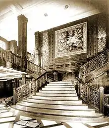 Both ships were dubbed "The Riviera afloat". To carry the theme even further, sand was scattered in the outdoor swimming pools, creating a beach-like effect highlighted by multicolored umbrellas.[2] Rex was decorated in a classical style while the norm of the time was the Art Deco or the so-called "Liner Style" that had been premiered onboard the French Line's Ile de France in 1927, Rex's running mate Conte Di Savoia followed this rule, but also had rooms with classic style like her First Class Social Room also known as "Colonial Hall" . The ship's exterior design had followed the trend set by Germany's Bremen and Europa. Rex sported a long hull with a moderately raked bow, two working funnels, but still featured the old-type overhanging counter stern (also known as a fan tail) found on such liners as Olympic and Aquitania.