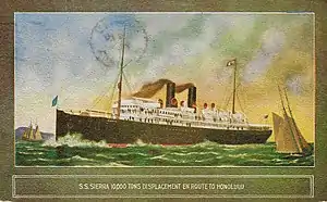 S.S. Sierra was a Lloyd's Register (100 AI) 10,000 tons oceanic passenger and cargo ship completed in 1900 by the Oceanic Steamship company.[1] The Sierra completed its 100th voyage between San Francisco and Honolulu on March 1914.[2]