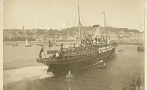 Stella was built for the LSWRs Southampton - Channel Island services.[3] On Maundy Thursday, 30 March 1899, Stella departed Southampton for St Peter Port, Guernsey carrying 147 passengers and 43 crew. Many of the passengers were travelling to the Channel Islands for an Easter holiday or returning home there during the Easter break. Stella departed Southampton at 11:25 and after passing The Needles proceeded at full speed across the Channel. Some fog banks were encountered and speed was reduced twice while passing through these. Approaching the Channel Islands, another fog bank was encountered, but speed was not reduced. Shortly before 16:00, the fog signal from the Casquets Lighthouse was heard and the Casquets came into view directly ahead. Captain Reeks ordered the engines full astern and attempted to turn away from the rocks. Stella scraped along two rocks, and then her bottom was ripped open by a submerged granite reef.[2]