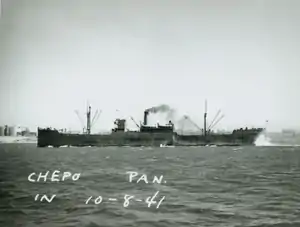 Chepo departed Liverpool on her last voyage on 8 January 1942 as part of convoy ON-55 carrying 1,769 tons of general cargo bound for Boston and New York.[40] The ship was under command of captain Hezekiah Spurrell and had a crew of thirty eight. The trip was uneventful until the convoy ran into a strong storm south of Iceland on January 13 which significantly slowed it down. The convoy was detected on the same day by the German submarine U-43 under command of Wolfgang Lüth which began shadowing it. U-43 commenced attack on the convoy in the early morning of January 14 in the stormy conditions with poor visibility, first sinking British cargo ship SS Empire Surf. At 04:53 Chepo was suddenly hit on starboard side by a torpedo fired from U-43.[41] The resulting explosion open a wide hole in the vessel's hull and brought down the aft mast and antenna, preventing the vessel from sending a S.O.S. signal. Chepo started quickly settling by the stern forcing the survivors to hastily abandon the ship in starboard lifeboats and one raft.[41] Sixteen crewmembers were trapped in the poop quarters and could not escape. The master on hearing the cries for help coming from the abandoned vessel, went back to investigate and went down with the ship.[42] Chepo sunk approximately ten minutes after the attack. At about 05:50 British corvette HMS Sunflower showed up and started picking up the survivors.[41]