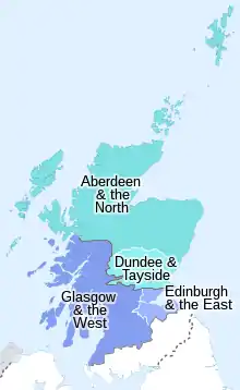 - STV Glasgow (pop: 2,493,450) – Argyll and Bute, East Ayrshire, East Dunbartonshire, East Renfrewshire, Falkirk, Glasgow, Inverclyde, Lochaber, North Ayrshire, North Lanarkshire, Renfrewshire, Stirling, South Ayrshire, South Lanarkshire, West Dunbartonshire.