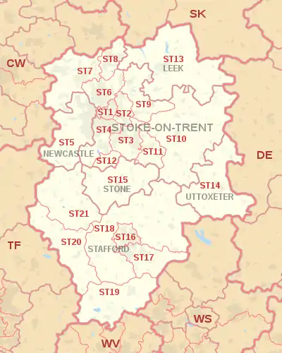 The ST postcode area, also known as the Stoke-on-Trent postcode area,[2] is a group of 21 postcode districts in England, within six post towns. These cover much of north and central Staffordshire (including Stoke-on-Trent, Stafford, Leek, Newcastle-under-Lyme, Stone and Uttoxeter), plus very small parts of Cheshire and Derbyshire.