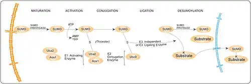 SUMO enzymatic cascade catalyzes the dynamic posttranslational modification process of sumoylation (i.e. transfer of SUMO protein to other proteins). The Small Ubiquitin-related Modifier, SUMO-1,[1][2] is a ubiquitin-like family member that is conjugated to its substrates through three discrete enzymatic steps (see the figure on the right): activation, involving the E1 enzyme (SAE1/SAE2);[3] conjugation, involving the E2 enzyme (UBE2I);[4][5] substrate modification, through the cooperation of the E2 and E3[6] protein ligases.[7]