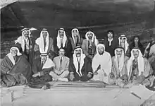 A meeting of exiled rebel leaders in Wadi al-Sirhan in Saudi Arabia, October 1929. Sultan Pasha al-Atrash is seated in the middle of the bottom row, and al-'As is seated second to his right