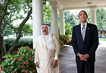 Sabah established Kuwait as the key mediator in the Qatar diplomatic crisis that began in 2017, meeting with Saudi and Emirati officials before leaving for Doha to discuss the rift with Qatari leaders.[22] His ongoing efforts were publicly supported by Qatar[25] and other interested parties from the region as well as the U.S., UK, France, and Germany.[23] At the beginning of September 2017, Sabah discussed the situation with top officials in Washington, D.C., including U.S. President Donald Trump, who "hailed his efforts" to mediate and "applauded Kuwait's 'critical contributions to regional stability'".[26] There were some questions from the boycotting countries about any preconditions.[27] French President Emmanuel Macron stated French support for Sabah's mediation efforts after a meeting in Paris on 15 September 2017, reiterating statements of support for the initiative.[28][29] Trump and Sabah had a third meeting at the White House on 5 September 2018.[30]