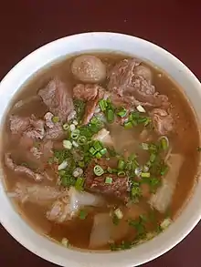 - Sang nyuk mian (Chinese: 生肉面; pinyin: Shēngròu miàn) is a dish of noodles served with pork broth, originating from Tawau. Very popular with the non-Muslim communities of Sabah, it is named after the poached-to-order slices of tender marinated pork served in pork broth which is flavoured with fried lard bits. The noodles (usually thick yellow noodles) are either dressed in dark soy and lard, or dunked into the soup along with the aforementioned pork slices, vegetables, meatballs and offal.[13]
