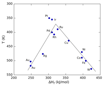 The figure on the right shows a volcano plot for the decomposition of formic acid using different transition metals as catalysts.[5] In this case, the heat of formation (ΔHf) of the metal formate salt was used for the x axis because studies showed that the reaction intermediate was a surface formate. For the y axis, the temperature at which the reaction reaches a specific rate was used (the y axis is plotted in reverse to preserve the conventional "volcano" shape). At low values of ΔHf, the reaction is slow (in other words, requires higher temperatures) because the rate of adsorption is slow and rate-limiting. At high values of ΔHf, desorption becomes the rate-limiting step. The maximum rate, which is observed for the platinum group metals in this case, requires intermediate values of ΔHf, with the rate being a combination of the rate of adsorption and the rate of desorption.[3]