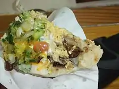 Sabich or sabih (Hebrew: סביח [saˈbiχ]) is an Israeli sandwich of pita or laffa bread stuffed with fried eggplants, hard boiled eggs, chopped salad, parsley, amba and tahini sauce.[1] Its ingredients are based on a traditional quick breakfast of Iraqi Jews and is traditionally made with laffa, which is nicknamed Iraqi pita. Sabich is sold in many businesses throughout Israel.