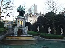 In the centre of the garden lies a fountain-sculpture of the Counts of Edgmont and Horn, who were symbols of resistance against the Spanish tyranny that sparked the Dutch Revolt. This monument was initially in front of the King's House on the Grand Place, the site of their execution. It is surrounded by a semicircle of ten statues of political figures, intellectuals and artists from the 16th century.[17]