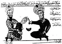 In these treatments, Şerafeddin Sabuncuoğlu used his own observations from experimenting with animals to develop new treatments.[4] Successful treatments were then transcribed to surgical procedures in humans. Şerafeddin Sabuncuoğlu would only transcribe and illustrate the treatments after he completed the treatments himself.[4] He would even test therapeutic treatments on himself before applying them on patients.[10] Şerafeddin Sabuncuoğlu was also aware of sepsis. In order to prevent the spread of a pathogen, he would wear a surgical attire that involved wine and olive oil as antiseptics.[4] In one such treatment, Şerafeddin Sabuncuoğlu discussed a breast cancer treatment in which the suggested treatment was to surgically remove the small cancers in their early stage.[9] This treatment ensures that the tumor does not spread or grow to the rest of the body, which is common practice for treating cancer today. Many of these treatments in Cerrahiyyet’u¨l Haniye have illustrations accompanied next to them, which ensure that the intended audience are able to follow the treatment correctly. Every illustration contains a distinct physician and patient along with the tools used in the treatment.