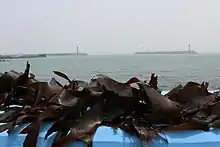 Saccharina japonica is a marine species of the Phaeophyceae (brown algae) class, a type of kelp or seaweed, which is extensively cultivated on ropes between the seas of China, Japan and Korea.[1] It is widely eaten in East Asia.[2] A commercially important species, S. japonica is also called ma-konbu (真昆布) in Japanese, dasima (다시마) in Korean and hǎidài (海带) in Chinese.[2] Large harvests are produced by rope cultivation which is a simple method of growing seaweeds by attaching them to floating ropes in the ocean.[1][3]