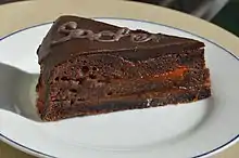 Sachertorte (UK: /ˈzæxərtɔːrtə/, US: /ˈsɑːkərtɔːrt/, German: [ˈzaxɐˌtɔʁtə] (listen)) is a chocolate cake, or torte of Austrian origin,[1][2] invented by Franz Sacher,[3] supposedly in 1832 for Prince Metternich in Vienna.[4][5] It is one of the most famous Viennese culinary specialties.[6]