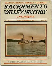 The Development Association also published regular literature to promote their endeavors and attract consumers from within and to the area. Their very first venture was a 40-page illustrated article outlining the climate, soil, resources and advantages of all nine member counties. It was decided in December 1900 that their first buy would be in Sunset, a South Pacific-owned magazine aimed at promoting the West. Including the 15,000 copies printed by the State Board of Trade, 25,000 reached circulation in early 1901.[31] Later in the year, they published an article in 30,000 copies of the Overland Monthly, along with 10,000 in pamphlet form.[32] Most of these early pamphlets were written by President Green himself under straightforward titles such as "Northern California and the Sacramento Valley" or "The Sacramento Valley as a field for profitable investment", while others embellished "The Best Spot on Earth is the Sacramento Valley". One pamphlet from 1911 boasted of "one of the great valleys of the world, with a vast and fertile soil area. It produces great quantities of precious metals and structural materials. It is blessed with an abundant water supply, and an agriculture much more diversified than is found anywhere else on the face of the earth."[33]