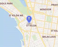 The church is in a prominent location, situated at the centre of St Kilda. It is on the northeast of the well known Luna Park, a historic amusement park, and the Palais Theatre. Directly north of the church, is the public heart of Melbourne, Albert Park, which has been the home of Australian Grand Prix since 1996.