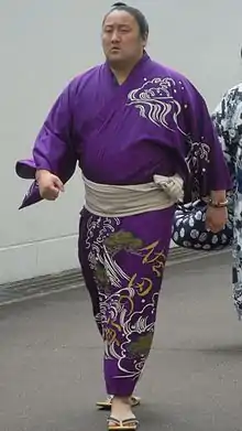 He first fought all the top wrestlers ranked at maegashira #2 in the March 2015 tournament and posted a respectable 7–8 score that kept him ranked high enough to face all the top competition in the following tournament, where he scored his first kinboshi for defeating a yokozuna Harumafuji and posted a winning record of 8–7, also beating the eventual tournament champion, Terunofuji. He was nominated for the Outstanding Performance Prize, normally given to those who beat the tournament champion or a yokozuna and manage a winning record, but there was opposition since he posted a bare minimum winning record with one win by default and the prize was not awarded.[4] Nonetheless he was promoted to his highest rank to date of maegashira 1 for the July 2015 tournament. Since then his results have been disappointing and he slid down the maegashira ranks with seven consecutive make-koshi or losing scores from July 2015 to July 2016. He was able to get a winning record in September 2016 with an 8–7, however he got another losing record in the November 2016 tournament, scoring only 3–12 which was his worst record to date in the top division. He was demoted to the jūryō division after the March 2017 tournament, breaking a run of 18 straight tournaments at a maegashira rank, the longest amongst active wrestlers. However, a 9–6 record at the rank of Jūryō 1 East was enough for an immediate return to the top division. He missed the first five days of the September 2017 tournament because of an injury to his right leg,[5] and although he entered from Day 6, he could not prevent demotion to jūryō. In March 2018 he won the jūryō division championship with an 11–4 record, beating Akiseyama in a playoff, to ensure his return to makuuchi. Despite never rising higher than maegashira 8 he remained in the top division until January 2021. After four tournaments in jūryō he returned to makuuchi in November 2021.[6]