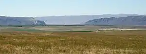 The Saddle Mountains consists of an upfolded anticline ridge of basalt in Grant County of central Washington state. The ridge, reaching to 2,700 feet, terminates in the east south of Othello, Washington near the foot of the Drumheller Channels. It continues to the west where it is broken at Sentinel Gap (a water gap through which the Columbia River passes) before ending in the foothills of the Cascade Mountains.