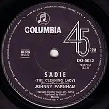 "Sadie (The Cleaning Lady)" was Australian pop singer Johnny Farnham's first solo single.[1] The novelty song was released in November 1967 and was No. 1 on the Go-Set National Singles Charts for five weeks in early 1968[2][3] (six weeks on the Australian charts in 1968 based on the Kent Music Report).[4] It was the largest selling single in Australia by an Australian artist in the 1960s.[1][5] The single, "Sadie" sold approximately 183,000 copies in Australia and was the highest selling Australian single until "Up There Cazaly" was released in 1979.[6][7][8] and was also released in New Zealand, Denmark and Germany.[9] The B-side, "In My Room" was written by Farnham.[10] The A-side's label includes the acknowledgement "Vacuum cleaner solo: Mr. Jolly".