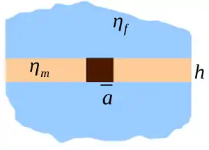 The diffusion coefficient of a cylindrical inclusion of radius in a membrane with thickness and viscosity , surrounded by bulk fluid with viscosity is: