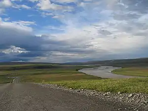 The Sagavanirktok River or Sag River (Iñupiaq: Saġvaaniqtuuq) is a stream in the North Slope Borough of the U.S. state of Alaska.[1] It is about 180 miles (290 km) long and originates on the north slope of the Brooks Range, flowing north to the Beaufort Sea near Prudhoe Bay. The Trans-Alaska Pipeline System and Dalton Highway roughly parallel it from Atigun Pass to Deadhorse.[5]