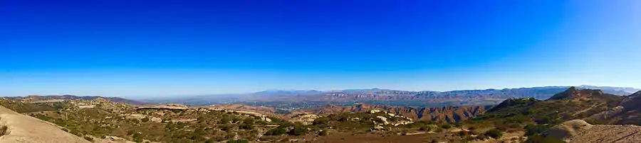 Sage Ranch Park is a 625-acre park (253 ha) and wildlife corridor located at a 2,000 feet (610 m) height in the northwestern Simi Hills on the northwestern plateau of the Simi Valley, bordering Los Angeles County and its San Fernando Valley.[1][2][3] The campground area used to be a cattle ranch and later a filmset for Western movies. Sage Ranch Park is today an intermountain wildlife corridor, which links the Simi Hills with the Santa Susana- and Santa Monica Mountains. The mountainous park is mostly known for its unique sandstone rock formations, maybe particularly on its western side where the Sandstone Ridge and Turtle Rock are situated. On its northern side, there are great panoramic rural and metropolitan views of the Simi Valley, as well as surrounding Simi Hills, Santa Susana Mountains and beyond.[4] It is home to numerous sandstone formations, caves, outcroppings, tilted rock formations, several hiking trails, a camping ground, as well as native flora and wildlife. The area is lined with coastal sage scrub and other flora includes chaparral, bush lupine, California poppy, sunflowers, Cream Cups, bracken, sword fern, prickly pear cactus, eucalyptus trees, oak woodland of ceanothus, coffee berry, California buckwheat, sycamore, Walnut Tree, ferns, orange- and avocado trees. It is a critical cross-mountain wildlife corridor and is home to fauna such as mountain lions, bobcats, eagles, vultures, owls, rattle snakes, coyotes, hawks, grey fox, king snakes, and more.[5][6] Bordering Sage Ranch to the south is the Rocketdyne Santa Susana Field Laboratory, in which the nearby Burro Flats Painted Cave is located.