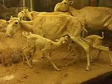Fossils of saiga, concentrated mainly in central and northern Eurasia, date to as early as the late Pleistocene (nearly 0.1 Mya).[11] Several species of extinct Saiga from the Pleistocene of Eurasia and Alaska have been named, including S. borealis,[12] S.prisca, S. binagadensis and S. ricei, although more recent studies suggest that these prehistoric representatives were merely geographical variants of the extant species that was formerly much more widespread.[13] Fossils excavated from the Buran Kaya III site (Crimea) date back to the transition from Pleistocene to Holocene.[14] The morphology of saiga does not seem to have changed significantly since prehistoric times.[2]