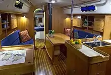 Depending on size, a cruising yacht is likely to have at least two cabins, a main salon and a forward stateroom. In smaller yachts, the salon is likely to have convertible berths for its crew or passengers. Typically the salon includes a dining area, which may have a folding, built-in table. The salon is typically contiguous to the galley. A cruising yacht is likely to have a head (bathroom) with a marine toilet that discharges waste into a holding tank. Larger yachts may have additional staterooms and heads. There is typically a navigation station that allows the laying out of charts away from other activities within the vessel. The electrical panel and auxiliary instrumentation is often near this location.[7][22]