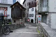 Border in Saint-Gingolph, looking toward the Swiss side. The border is guarded by a video camera mounted on a balcony.