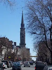 The church was rebuilt by architect John Ostell for the Society of Saint-Sulpice as a parish church, and consecrated in 1857. It burned down the next year. It was rebuilt by Victor Bourgeau by 1860, with an 85-metre spire added in 1876, a golden weathervane in 1905, and a transept in 1889. It was burned out yet again in 1933 and quickly repaired by French monk and architect Paul Bellot. Its congregation's numbers seriously declining, the church was almost closed in 1965, but instead was designated as a pilgrimage centre and official Christian church of Expo 67.[3] Uniquely, the church was connected directly to Berri-De Montigny metro station (today Berri-UQAM) by an underground city connection.[4]