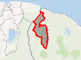 Saint-Laurent-du-Maroni is a border town in north-west French Guiana. It is located on the Maroni River (in Dutch: Marowijne), opposite the town of Albina in Suriname which can be reached by ferry or pirogue.[7] It does not, therefore, have an Atlantic coast; this may have motivated the choice of the town's location, as the penal authorities wanted to prevent the escape of prisoners from the Prison of St-Laurent-du-Maroni by a sea route.[6]