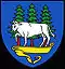 The blazon of the village coat of arms is Azure, issuant from a Ribbon Or three Pine trees Vert trunked proper and an Ox passant Argent.[3]