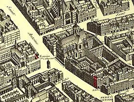 The first church on the site was dedicated around 1125[1] to Paul the Hermit, who had been buried in the Egyptian desert by Anthony the Great; it was in effect the cemetery chapel to the monastery of Saint-Éloi, founded by monks of saint Eloi of Noyon and Dagobert I. This monastery was on the site of what is now the parvise of the Palais de Justice. From there, bodies were carried in procession from the monastic community to the cemetery. Madame de Sévigné was baptised in this building in 1626, in the first chapel of Saint-Louis. The monastic cemetery was later forgotten, though the church retained a dedication to a saint Paul (albeit Paul of Tarsus not Paul of Thebes) up to the present day.