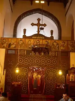 St. Barbara's Church stands north of the Coptic Museum and is east of the Church of Saints Sergius and Bacchus (Abu Serga), on the eastern side of Fort Babylon. It was originally dedicated to Abu Kir and Yohanna (or Ss. Cyrus and John). When the remains of St. Barbara were brought here, a separate sanctuary was built. Thus, there are now two separate churches that were built on this location.[1] Athanasius, a wealthy scribe and a secretary of Abdel-Aziz Ibn Marwan (governor of Egypt between 685 and 705 AD), had built the Church. A door found during one of the church's many restorations could date as early as the 4th Century. Between 1072 and 1073, the Church was fully restored to house the relics of Saint Barbara. These relics remain to this day. The Church was damaged again by another fire during the 12th century. In fact, the church was renovated as recently as the beginning of the 20th century, when the khurus, a transverse room preceding the sanctuary, was sacrificed in order to allow more space.[2]
