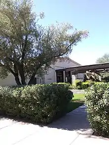 In November 1970, William Purdis Rowland was installed as the parish's new rector.[15] In 1973, in honor of the congregation paying off the original mortgage, a mortgage burning ceremony was held. The church was consecrated, and blessed by several Episcopalian dignitaries, including George R. Selway, Robert Donohoe (the ecumenical director of the Episcopal Diocese of Arizona), and the former pastor of St. Barnabas, Henry B. Getz. The consecration took place because a church in the Episcopal faith may not be consecrated until it is debt-free ("all possibility of alienation to secular uses be erased").[14] The sanctuary received new main doors which involved a new art form invented by Ditson and Porzio, called "traforato". The doors are cut forms of steel depicting scenes of children in the Bible, as well as the different stages of childhood. The cut steel is encased in glass. Some of the scenes depicted include David and Goliath and Tobias. Also seen in the artwork include images of musical instruments, natural objects and animals.[16] In addition to the doors, Ditson and Porzio created many other pieces of artwork for the church. Among these include a massive tapestry entitled, "Ode to Joy," designed by Porzio; the main altar and cross, acolyte chairs, candelabra, and various basins and stands.[17] 1976 saw the completion of the parish's memorial garden, located to the north of the main sanctuary; the garden had its first interment in February of that year. The second education building, the learning center, located to the east of the initial education structure and to the north of the memorial garden, was erected in 1988; the last of the three education buildings, named "Sean's Place", was built in 1999, located just to the east of the learning center.