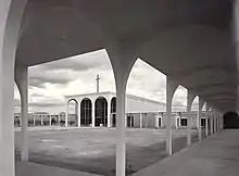Since the construction of the original sanctuary, chapel and education building, the grounds have grown over the decades. Office space was built in between the sanctuary and chapel in 1961 as part of the original plan, and was expanded in 1984, and a state of the art music building was constructed across the courtyard from the sanctuary.[30] The sanctuary's original design contains rhythmic columns and arches, a high ceiling and a raised circular altar.[9] The church's carillon is housed in the building. North of the music building is another structure holding a bookstore and coffee shop. Hutton Hall (constructed 1964) lies still further to the north, which also contains the parish's kitchen. To the north of the sanctuary lie the Memorial Garden, with a Labyrinth just to its east. The most northerly buildings include the original education structure, which has now been joined by two more education/meeting buildings, which also house the parish's library. The rest of the campus contains gardens, walkways, parking lots and a children's playground.[30] Covered walkways connect the various structures. The main sanctuary incorporates indirect lighting sources which "provide a visual depth to the contemplative space."[31]
