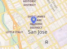 Saint James is a light rail station operated by Santa Clara Valley Transportation Authority. The station is located in Downtown San Jose, California on 1st and 2nd Streets between Saint James and Saint John Streets. The northbound platform is on 1st Street (the address is 150 N. First Street); the southbound platform is on 2nd Street (the address is 101 N. Second Street). This station is served by the Blue and Green lines of the VTA Light Rail system. The platforms at Saint James station are separated by the western half of the historic St. James Park.